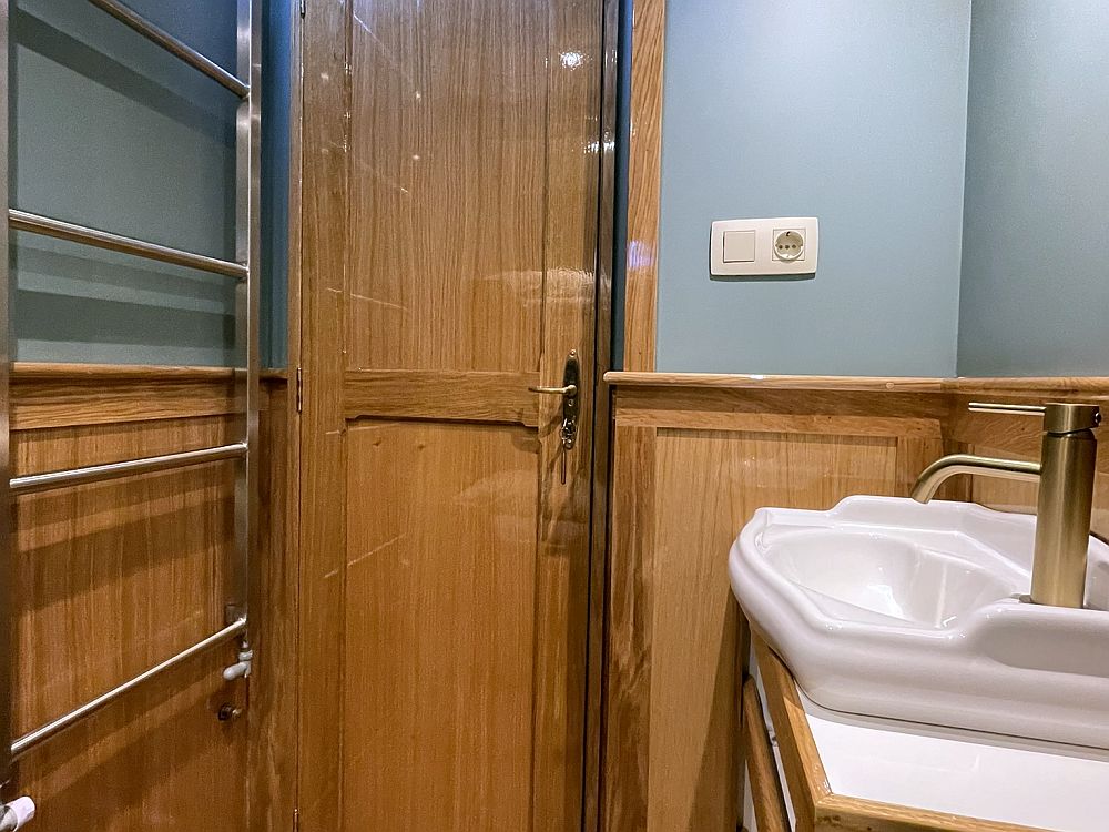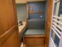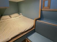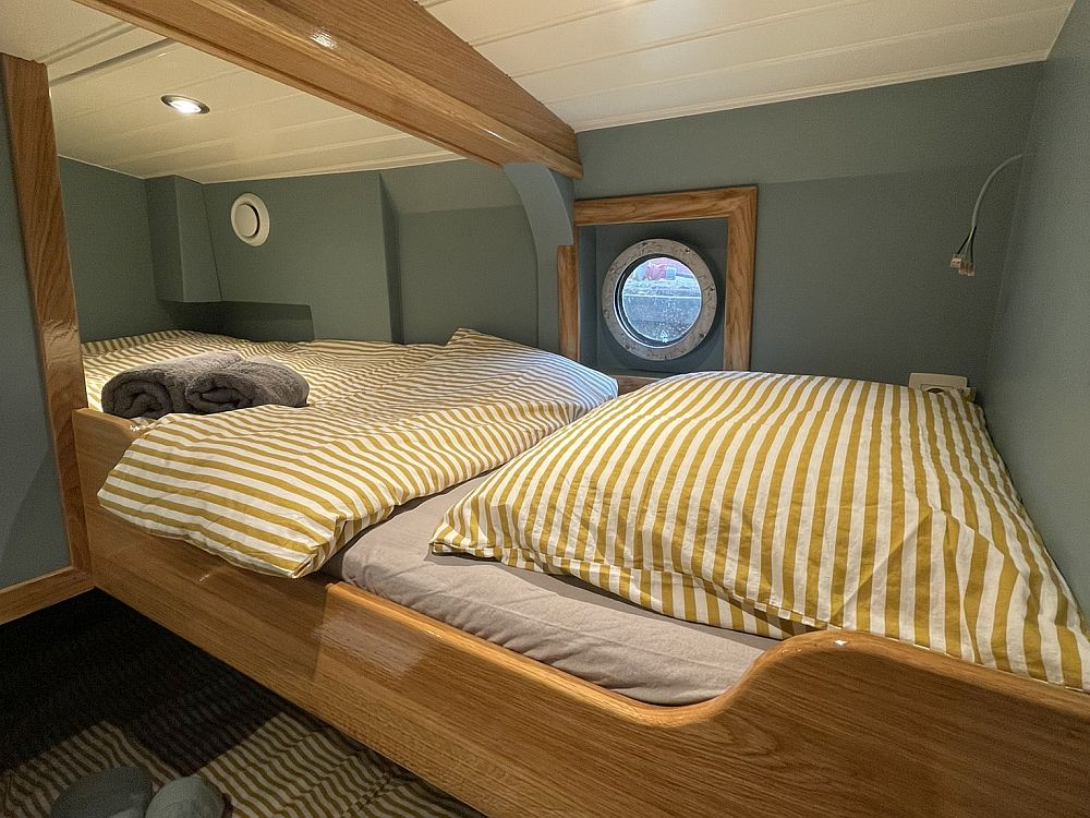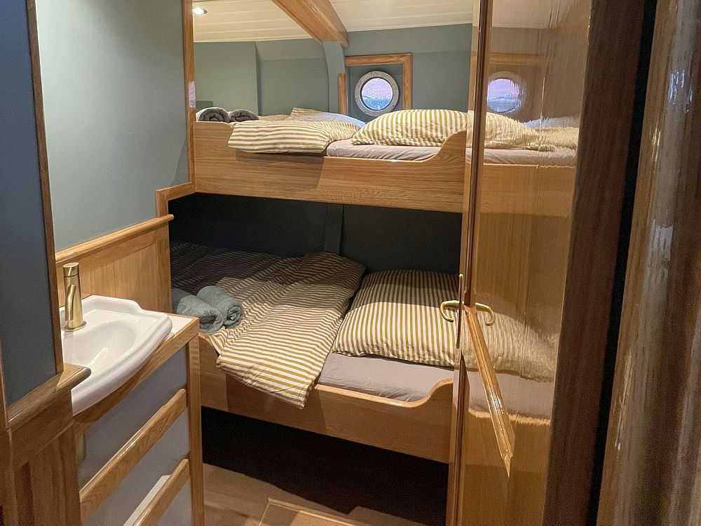 Unsere Gäste schlafen in Doppelkabinen mit Doppelkoje und eigener Dusche und Toilette oder in einer Doppelkabine mit Etagenbett und separater Dusche und Toilette im Flur. Jede Kabine verfügt über ein Waschbecken, Zentralheizung und ein mechanisches Belüftungssystem.