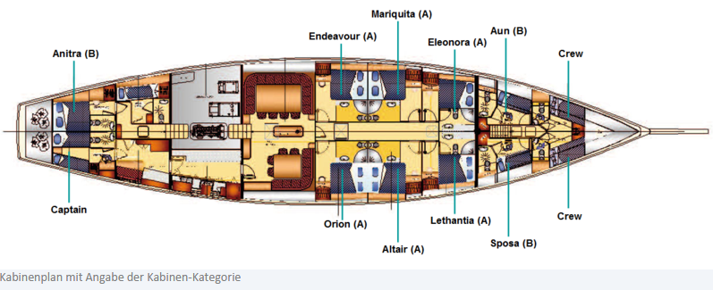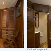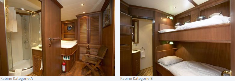 Es können 26 Gäste in 13 komfortablen Doppelkabinen - alle klimatisiert (individuell regulierbar) und mit eigenem Bad - übernachten. Darüberhinaus können in den Deluxe Cabins bis zu 10 Zusatzbetten aufgestellt werden.